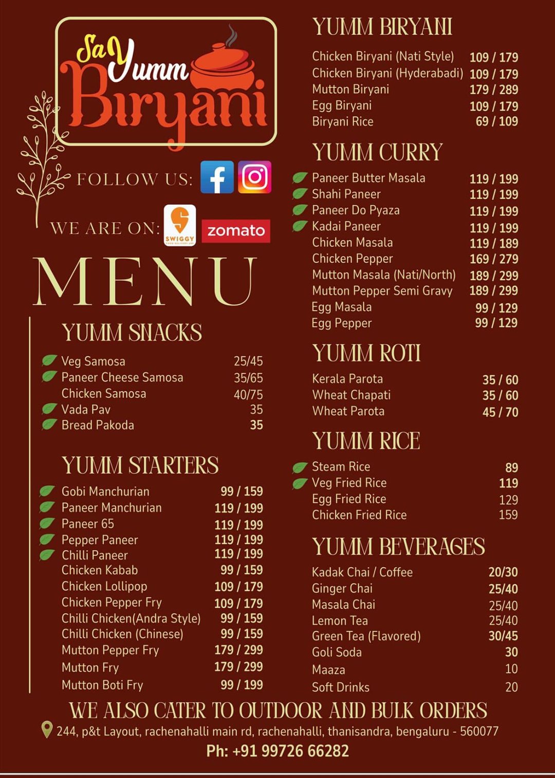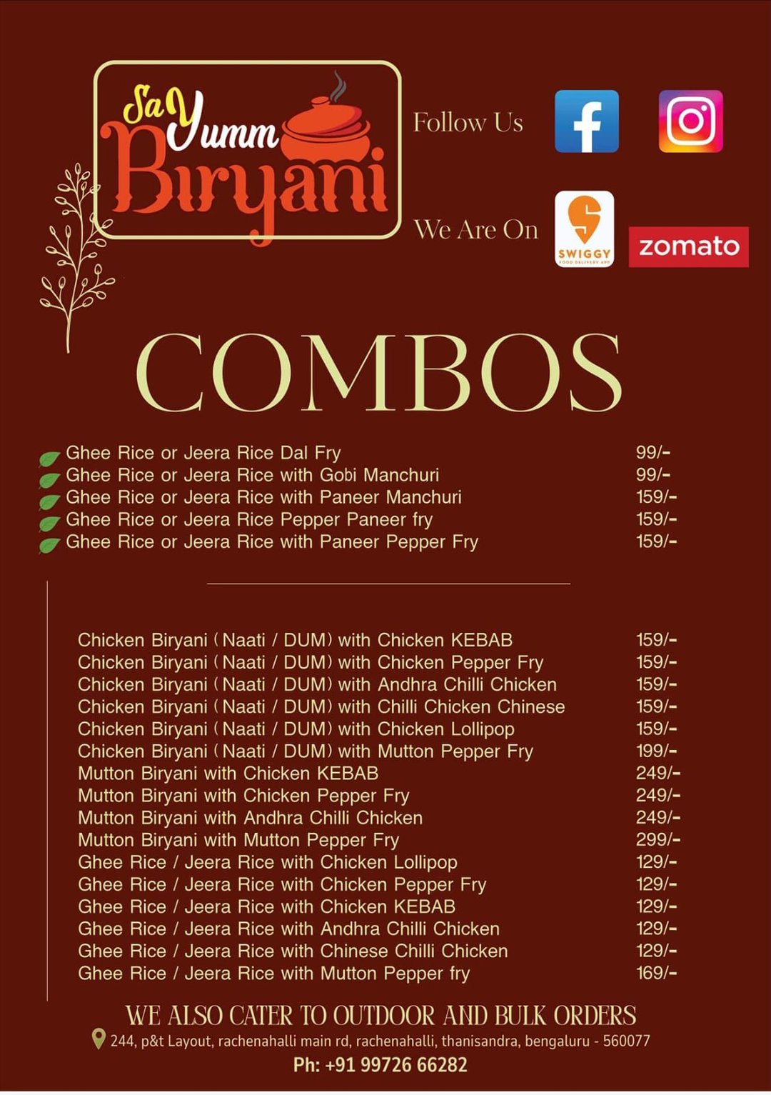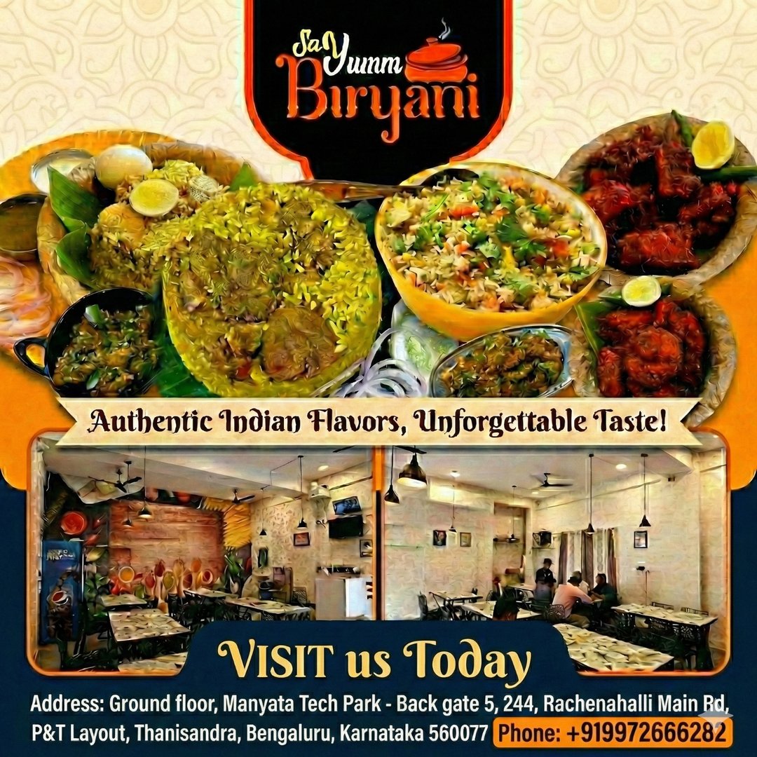 SaYumm Biryani – Where Every Bite Says Yumm! At SaYumm Biryani, we serve the perfect blend of authentic flavors and modern taste. From our aromatic biryanis cooked with premium jeera samba rice to mouthwatering starters, curries, and fresh rotis, every dish is crafted with care and love. Whether you’re here for a quick bite, a family meal, or a festive celebration, SaYumm Biryani promises a warm ambiance, friendly service, and food that will keep you coming back for more.